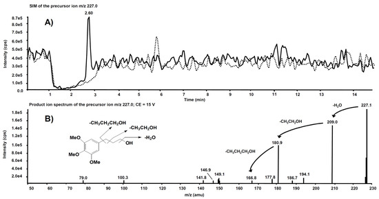 (A) Superimposed mass chromatograms of the m/z 227.0 precursor ion, obtained from the rat liver microsomal fraction at t = 0 (dotted line) and t = 2 h (continuous line) incubation with compound 5. (B) Product ion spectrum of the selected m/z 227.0 precursor, collected at 2.60 min, from the latter analysis.