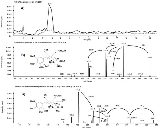Analogue experiments were executed on the rat liver microsomal fraction incubated with compound 7. The m/z 288.0 precursor ion isolated on Q1 corresponds to the molecular ion of the alleged metabolite 7 obtained after single de-nitration of the side chain. Figure 10A reports the comparison of the m/z 288.0 chromatographic profiles obtained from the rat liver microsomal fraction before the incubation with compound 7 and after two hours, respectively. This time, a chromatographic peak is evident at the retention time of 3.78 min only in the profile from the rat liver microsomal fraction collected after two hours’ incubation. The corresponding product ion spectrum, depicted in Figure 10B, exhibits a fragmentation similar to Figure 9B. The product ion spectrum of 7 is also reported (Figure 10C) for comparison: several fragmentations similar to those present in the product ion spectrum of its alleged metabolite are indeed observed.