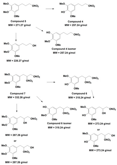 On the basis of the analytical data, the metabolic pathway reported in Figure 12 is proposed for compounds 5 and 7. The identification of the metabolic products suggests that hydroxyl derivatives are produced by de-nitration of the side chain and also by de-methylation of both methoxy substituents present in the para- and meta- position with respect to the propyl-nitrate chain. The two isomers originating from the latter process can be easily distinguished on the basis of their well-separated retention time, even if they have the same molecular weight and similar mass spectrometric fragmentation. In the single de-nitration process involving compounds 6 and 7, the analytical data cannot distinguish whether the process involved the nitro group located at the middle or at the extreme position of the side chain.