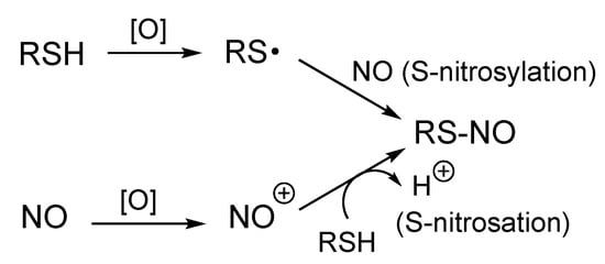 - Lancaster, J.R., Jr. How are nitrosothiols formed de novo in vivo? Arch. Biochem. Biophys. 2017, 617, 137–144. [Google Scholar] [CrossRef]
