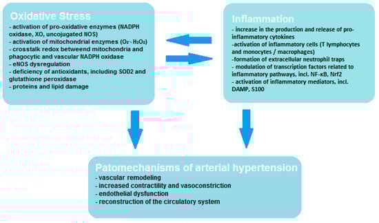 According to the mosaic theory, the development of AH is influenced by many regulatory mechanisms, such as anatomical, genetic, endocrine, humoral, hemodynamic, environmental or adaptive neural factors, and, presumably, oxidative stress may contribute to each of the factors mentioned above [9]. Physiologically, ROS as signaling molecules play an essential role in the regulation of endothelial function. However, in a situation of overproduction and overactivity, they promote ED, lipid peroxidation, inflammation, increased contractility and vascular remodeling, leading to the development and progression of AH [9,10,11].