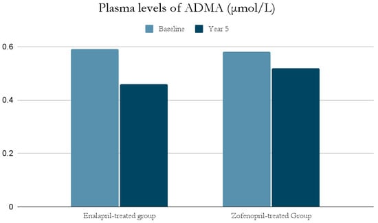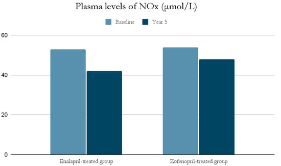 The ACE-I group includes drugs that differ in their functional group, which can alter the effect of a particular drug. For example, enalapril has a carboxylate group and zofenopril has two sulfhydryl groups. It has been observed that both enalapril and zofenopril treatment resulted in a significant reduction in plasma NOx and ADMA concentrations (Figure 2 and Figure 3) [37].