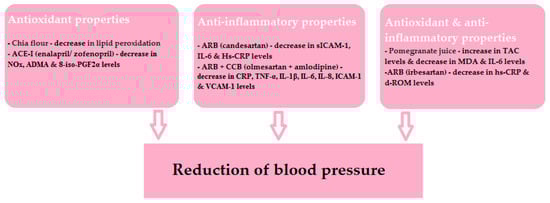 In our publication we focused on the correlation of AH with oxidative stress and inflammation, which are influenced by many factors, such as diet, supplementation and drug treatment. It is believed that the imbalance between the amount of oxidants and antioxidants production results in DNA, protein and lipid damage. By contributing to cell and tissue impairment, these processes promote the development and progression of AH. The underlying causes of this multifactorial disease are numerous processes, among which ED, inflammation, increased vascular contractility and remodeling play crucial roles in inducing stiffening of large elastic arteries, loss of stiffness, other changes to mechanical properties and remodeling of CV tissue. Studies show that the addition of a single dietary ingredient can have a beneficial effect on BP values. Although the association of the hypotensive effect with the antioxidant and anti-inflammatory properties of blueberries, strawberries and chia requires further study, it was revealed that there is a correlation between the decrease in SBP and DBP and the antioxidant and anti-inflammatory effects of pomegranate juice. The effect of drug treatment of AH on oxidative stress and inflammation has also been analyzed. The study shows that most of the major groups of hypotensive drugs have antioxidant and/or anti-inflammatory properties. Thus, the use of drug therapy in hypertensive patients seems to provide protection against organ damage.