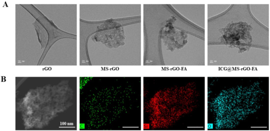 (A) TEM images of rGO, MS-rGO, MS-rGO-FA, and ICG@MS-rGO-FA nanocomposites. (B) EDX mapping of MS-rGO nanocomposites.