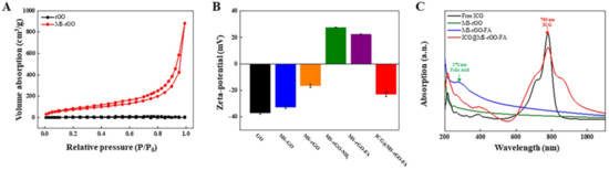 The physicochemical properties of ICG@MS-rGO-FA nanocomposites. (A) N2 adsorption-desorption isotherm of rGO and MS-rGO nanocomposites. (B) Zeta-potential of ICG@MS-rGO-FA nanocomposites. (C) UV-vis spectra of free ICG, MS-rGO-mPEG, MS-rGO-FA, and ICG@MS-rGO-FA nanocomposites.
