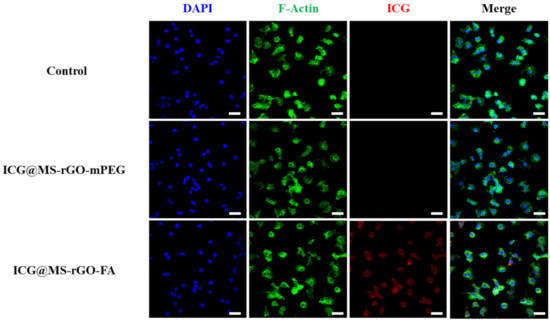 In NIH-3T3 fibroblast and CT-26 cells, the cellular uptake and endocytosis pathways of nanocomposites were evaluated by using confocal laser scanning microscopy (CLSM, LSM 880, Carl Zeiss, Jena, Germany). The cells were seeded in 8-well plates (ibidi, Munich, Germany) at a density of 2 × 104 cells/mL. The cells were incubated with ICG@MS-rGO-FA nanocomposites (100 μg) in 1 mL serum-free medium for 4 h. Subsequently, the cells were washed three times with DPBS to remove the remaining nanocomposites and then fixed with 4% paraformaldehyde for 15 min. After treatment with 0.1% Triton X-100 for 10 min at room temperature, the cells were stained with Alexa Fluor 488 phalloidin (1:200, Invitrogen, Waltham, MA, USA) for 1 day at 4 °C and 4′,6-diamidino-2-phenylindole (DAPI, Thermo Fisher Scientific, Waltham, MA, USA) for 5 min. The ICG@MS-rGO-mPEG nanocomposites were used as a control sample, and cellular uptake was also observed with the same protocol.