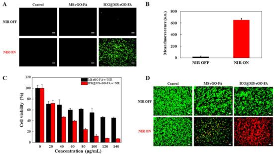 To investigate the photodynamic therapy of ICG@MS-rGO-FA nanocomposites via NIR laser irradiation, DPBF probes were applied for the detection of ROS from ICG-encapsulated nanocomposites (Figure S4). The ICG@MS-rGO-FA nanocomposites and DPBF probes were mixed and subsequently irradiated with an NIR laser every 2 min. In parallel, the control groups (only DPBF probe and ICG-free MS-rGO-FA nanocomposites) were treated in the same manner. In Figure S4A, the absorption intensity of ICG-encapsulated nanocomposites at 417 nm was inversely proportional to the exposure time of NIR light because DPBF probes were reacted with generated ROS from ICG@MS-rGO-FA nanocomposites [55]. In contrast, the control groups showed constant intensity regardless of NIR laser irradiation, suggesting that the generated ROS was insufficient (Figure S4B). Therefore, the excellent ROS generation capacity and enhanced photothermal property of ICG@MS-rGO-FA nanocomposites have great potential for NIR-mediated phototherapy applications.