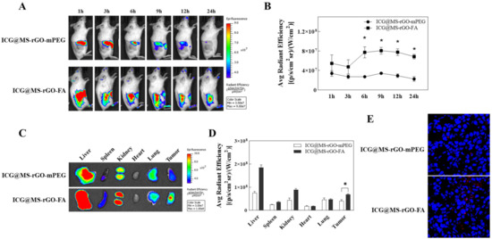 In vivo biodistribution imaging of ICG@MS-rGO-mPEG and ICG@MS-rGO-FA nanocomposites in CT-26 tumor-bearing mice. (A) Representative in vivo fluorescence imaging after i.v. injection at different times (1 h, 3 h, 6 h, 9 h, 12 h, and 24 h). (B) Fluorescence intensity of CT-26 tumor tissues (n = 4, * p < 0.05). (C) Representative ex vivo fluorescence imaging of major organs at 24 h post-injection. (D) Fluorescence intensity of major organs (n = 4, * p < 0.05). (E) Fluorescence microscopy imaging of tumor tissues.