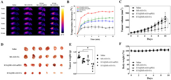 The surface area, pore volume, and pore size of MS-rGO nanocomposites were characterized by BET-BJH analysis (Figure 2A). The surface area and pore volume of the pure rGO nanosheet could not be calculated because they did not show N2 adsorption-desorption. On the other hand, the MS-rGO exhibited a large surface area (283.05 m2/g), pore volume (1.33 cm3/g), and pore size (3.8 nm). The N2 adsorption-desorption isotherm curve indicated that the MS-rGO nanocomposites were composed of well-defined mesoporous structures and small pore size distributions [44]. The surface charge and chemical construction of ICG@MS-rGO-FA nanocomposites were confirmed by zeta potential, FT-IR, and UV-vis spectroscopy. In Figure 2B, the zeta potentials of the MS-GO, MS-rGO, MS-rGO-NH2, MS-rGO-FA, and ICG@MS-rGO-FA nanocomposites were −32.6 ± 1.3, −16.5 ± 1.3, +27.5 ± 0.2 mV, +22.2 ± 0.5, and −23 ± 1.6 mV, respectively. These changes in the zeta potential implied the successful reduction, introduction of amine groups, conjugation of PEG-FA, and encapsulation of ICG molecules [45,50]. Figure S2 shows the FT-IR spectra of the MS-rGO and MS-rGO-FA nanocomposites. The strong peaks at 962 and 1074 cm−1 corresponding to the stretching vibration of Si-O-Si were attributed to the MS monolayer. The chemical conjugation of PEG-FA on MS-rGO nanocomposites was confirmed by the new characteristic peaks. The peaks of PEG were observed at 1350 and 1450 cm−1 due to the -CH2 and CH3 framework stretching in PEG. It also showed -C-O-C- asymmetrical and symmetrical stretching at 955 and 1100 cm−1 [45,50]. However, FA, the tumor-targeting ligand, was not detected by FT-IR analysis because its structure was similar to that of the PEG molecule [45]. Therefore, the presence of FA and encapsulated ICG was demonstrated by UV-vis spectroscopy measurement, showing that the spectra of MS-rGO nanocomposites did not show any absorption peak at 280 nm (Figure 2C). In contrast, MS-rGO-FA and ICG@MS-rGO-FA nanocomposites exhibited additional peaks in the same area. In the spectra of ICG@MS-rGO-FA nanocomposite, two strong peaks were observed at 710 and 780 nm. The new peaks at 280 nm and 700–800 nm indicated the successful conjugation of FA and encapsulation of ICG in the nanocomposites [51,52,53]. Additionally, we calculated the loading efficiency of ICG in the rGO nanocomposites with or without MS based on the UV-vis absorption spectra (at 780 nm). We observed that the loading efficiency of ICG in rGO-FA nanocomposites was only 6% in the absence of MS. In contrast, MS-rGO-FA nanocomposites showed approximately 22% loading efficiency, suggesting that the mesoporous structure of rGO nanosheet significantly improved the loading capacity of ICG molecules [54].