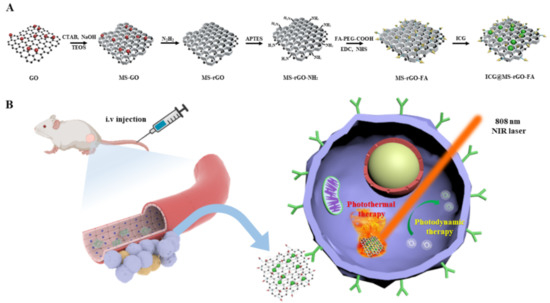 (A) Synthetic procedure of tumor targeted ICG-encapsulated MS-rGO-FA nanocomposites and (B) application for enhanced PTT and PDT dual therapy in colorectal cancer.