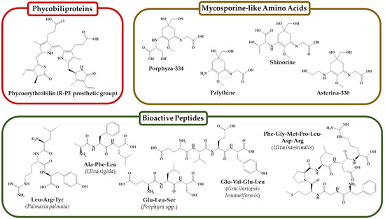 Chemical structure of the chromophore group of R-phycoerythrin, some relevant mycosporine-like amino acids, and bioactive peptides isolated from seaweed protein hydrolysates. Peptide sequences and source are presented in Table 3.