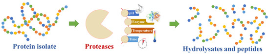 Schematic representation of seaweed protein hydrolysis into peptides. The hydrolyzation process usually involves the action of proteases and the adjustment of reaction parameters. Among the peptides produced by protein hydrolyzation, some display bioactive properties.