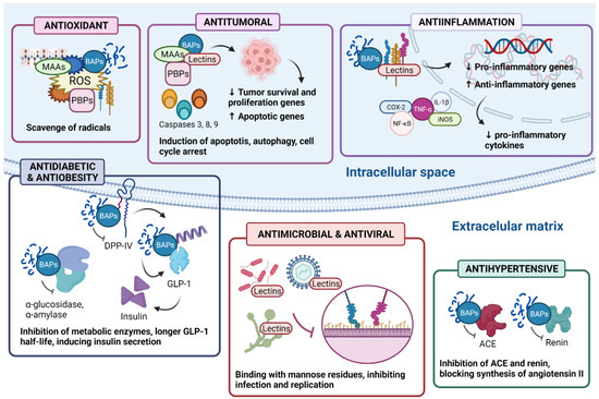 As described, a wide number of bioactive properties have been reported for SPs, derived hydrolysates, and peptides. However, as their study is still recent, many species and synthesized hydrolysates are yet to be further studied, as well as their possible mechanisms of action. As they are accounted for higher protein content, red algae have been the focus of research in this matter, making them more represented in literature than other groups. Nevertheless, some studies detail or elucidate these mechanisms based on their results. Figure 3 depicts a summary of the described mechanisms of action reported for SPs, BAPs, and MAAs.
