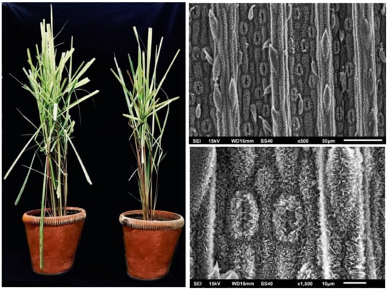 Lemongrass is also called Cochin grass, since 90% of its global export is organised from Cochin port, India []. Lemongrass plant has extensive potential as food and fodder given its richness in vitamins A, C, E, folate, niacin, and riboflavin, protein, antioxidants, and mineral nutrients, such as N (0.74%), P (0.07%), K (2.12%), S (0.19%), Mg (0.15%), Ca (0.36%), Zn (35.51 ppm), Mn (155.82%), Fe (126.73%), and Cu (56.64 ppm) [,]. Figure 1 illustrates the morphological attributes of the Cymbopogon flexuosus (Steud.) Wats plant and focuses on the characteristics of trichomes and stomata.