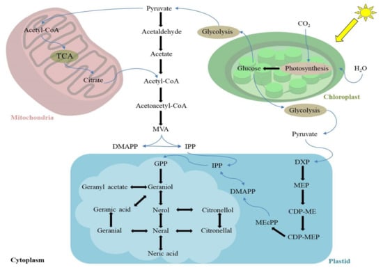 Lemongrass (Cymbopogon spp.) oil is a cocktail of various terpenes and terpenoids, out of which the major components belong to cyclic and acyclic monoterpenes. The monoterpenes are derived from geranyl diphosphate (GPP). The GPP is a fusion component of isopentenyl diphosphate (IPP) and its allylic isomer dimethylallyl diphosphate (DMAPP) (Figure 2). The IPP is a precursor of all the terpenes and terpenoids. Earlier it was widely accepted that plants produce IPP through a cytoplasmic mevalonate (MVA) pathway. However, empirical studies reveal that a newly discovered methylerythritol phosphate (MEP) pathway for monoterpenes biosynthesis is more dominant in lemongrass species []. The plastidic MEP pathway begins with the reaction of pyruvate with thiamine diphosphate (TPP), which yields hydroxyethyl-TPP. Hydroxyethyl-TPP, upon reacting with glyceraldehyde 3-phosphate (GAP), releases 1-deoxy-D-xylulose 5-phosphate (DXP). Subsequently, DXP rearranges and reduces to MEP, which is further phosphorylated and ultimately generates IPP.
