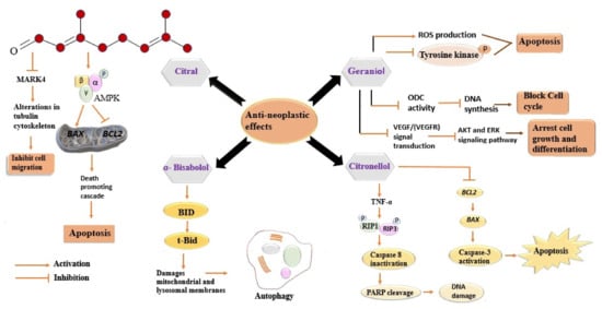 D-limonene, another constituent of LEO, was also reported to possess antineoplastic activity. D-limonene enhances the activity of carcinogen metabolizing enzymes, such as cytochrome P450, responsible for the conversion of carcinogens into less harmful forms and blocks their interaction with DNA []. Treatment of D-limonene on LS174T human colon cancer cells inhibited the P13K/Akt pathway and induced cell apoptosis. An increase in PARP cleavage and activation of caspase-3 indicates the involvement of the mitochondrial apoptotic pathway []. Limonene-mediated induction of apoptosis via increased expression of Bax and caspase-3 and decreased Bcl-2 expression has been reported in T24 bladder cancer cells. Moreover, limonene arrested the cell cycle in the G2/M phase and wound healing and transwell assay using Matrigel has confirmed the limonene mediated suppression of cancer cell migration and invasion []. Another component of the EO of lemongrass, citronellol, is also found to exert cytotoxic effects on several cancer cell lines [,,]. Citronellol showed its anticancer activity via increased reactive oxygen species production, alterations in mitochondrial permeability, DNA fragmentation, changes in cytochrome c activities, and activation of caspase, against the MCF-7 human mammary tumour cell line []. The cytotoxicity of α-bisabolol has been reported against human and rat malignant glioma cancer cell lines. In α-bisabolol-treated cell lines, the rapid loss of inner transmembrane potential and an increase in cytochrome-c translocation indicate that α-bisabolol can trigger apoptosis through mitochondrial intrinsic pathway []. Another experimental study has confirmed the cytotoxic effect of α-bisabolol against several cancer cell lines. α-bisabolol arrested cell cycle and initiated cancer cell death via a BID (BH3-only activator protein)-dependent mechanism []. It induces the permeability of the outer mitochondrial membrane and plays a crucial role during apoptosis []. α-bisabolol-induced damage to lysosomal and mitochondrial membranes via BID resulted in autophagy and regulated cell death, enlightening its modes of action [,,,].