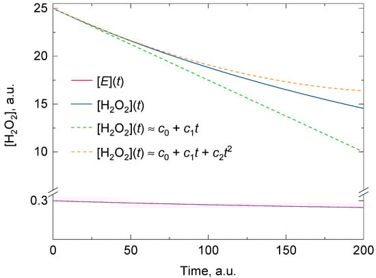 The computer algebra system Wolfram Mathematica v. 12.2 (Champaign, IL, USA) [17] was used to program scripts to solve the system of the first-order ordinary differential equations (ODEs) of the kinetic model of catalase, where it undergoes suicide substrate inactivation. The integrated analytical solutions for the rates of the H2O2 decomposition and the enzyme inactivation were obtained after considering the reverse reactions to be negligible. The values for the kinetic rate constants and the concentrations of the reactants were chosen to illustrate the (mis)match between the exponential time-dependence function of the reactant concentration (i.e., [H2O2]) and the one-degree and two-degree polynomial functions obtained using the Taylor series as time approaches zero. More details are included in the Results and Discussion section.