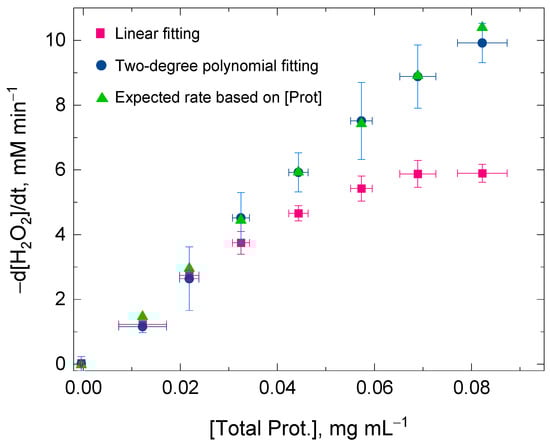 Figure 2 shows the values for the initial rate of the H2O2 decomposition by catalase using a linear fitting and a two-degree polynomial fitting for the same time domain (i.e., 2 min). At low protein concentrations, the values for the H2O2 decomposition rates obtained by either of the two fitting procedures were very similar within experimental error. However, the discrepancy of the values for the initial rates was more evident between the two fitting procedures at high protein concentrations—when the catalase concentration was also high—and the concurrent H2O2 decomposition and enzyme inactivation reactions were consequently more rapid (Equations (1) and (2)). At high protein concentrations, the changes in absorbance at 240 nm followed a clear curvilinear trend; therefore, a linear fitting was concluded to be inadequate for the kinetic analysis. The values for the H2O2 decomposition rate using the two-degree polynomial fitting showed a better linearity with protein concentrations, at least until the initial rate of the H2O2 decomposition reached values close to 10 mM min−1 in the reaction mixture (Figure 1). The reason for this discrepancy at high initial rates is methodological and is given in the next section. In conclusion, the two-degree polynomial fitting procedure surpassed the linear fitting procedure and also showed its validity for calculating the initial rate (at t = 0) regardless of the progress on the suicide substrate inactivation that catalase might undergo at t > 0 during the spectrophotometric measurement.