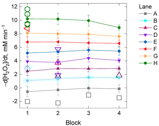 Mean values of the initial rate of the H2O2 decomposition by catalase in four different blocks of samples differing in the kinetic reading time imposed by their position in the 96-well microplate (Experiment II). Each of the mean values per block from Lane A to H (with increasing total protein concentration) belongs to 15 technical replicates of five repetitions as depicted schematically in Figure S2. The open colored symbols are outliers belonging to the lanes with the same color. See the Material and Methods section for further details.