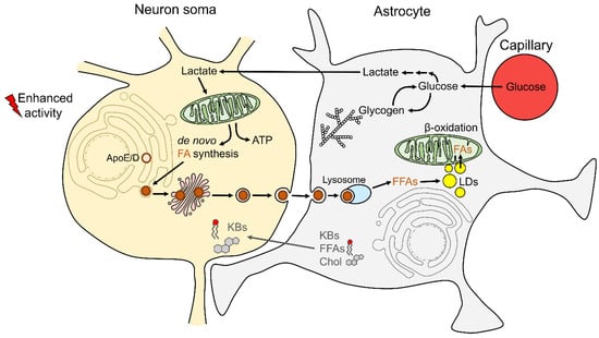 Recently, it has been shown that in response to neuronal activity (e.g., glutamate release), astrocytes break down LDs and consume FFAs by mitochondrial oxidation, which has been suggested to occur in the brain predominantly in astrocytes [3,8,91]. Mobilization of FFAs from LDs for mitochondrial β-oxidation can be achieved by cytosolic lipases [25,28,92] or by autophagosomal degradation of LDs [22,25,93]. However, which of these pathways prevails in astrocytes needs to be determined in the future. Neuronal activity also upregulates the expression of genes in astrocytes involved in energy metabolism and the neutralization of ROS to prevent lipid peroxidation and toxicity [8].