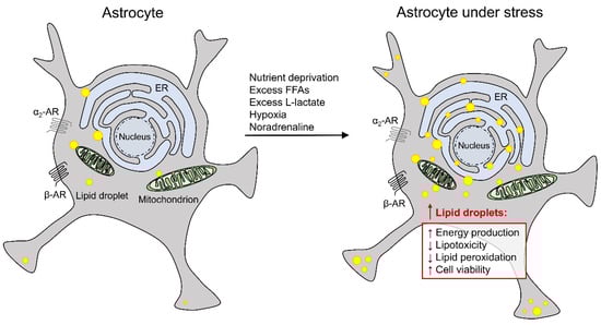 Astrocytes under stress accumulate lipid droplets. Most lipid droplets in astrocytes are in contact with or in close proximity to mitochondria and the endoplasmic reticulum (ER). Metabolic stress (nutrient deprivation, excess free fatty acids [FFAs] or L-lactate), hypoxic stress, and noradrenaline, which activates the CNS stress response via activation of α2- and β-adrenergic receptors (ARs), increase the accumulation of lipid droplets in astrocytes. Accumulation of lipids in LDs in stressed cells promotes astrocyte energy production via mitochondrial β-oxidation and prevents FFA-induced lipotoxicity and ROS-mediated membrane lipid peroxidation, which increases the viability of cells under stress (adapted from Smolič et al. [37]).