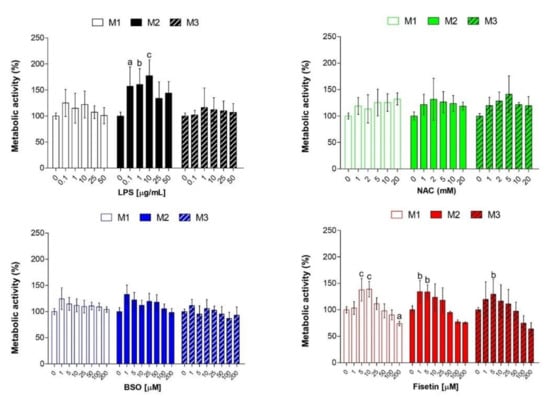 Cell metabolic activity in human pulp cells. Cell cultures were exposed to LPS, NAC, BSO or fisetin for 24 h. Optical density readings in untreated cultures (0 µM) were set to 100%. Bars show mean values ± standard deviations summarized from individual values in independent experiments (n = 4). M1 = complete growth medium; M2 = complete growth medium with dexamethasone and β-glycerophosphate; M3 = complete growth medium with dexamethasone, β-glycerophosphate and ascorbic acid. Lower case letters indicate significant differences between untreated cell cultures (0 µM) and treated samples: a (p < 0.01), b (p < 0.001) and c (p < 0.0001).