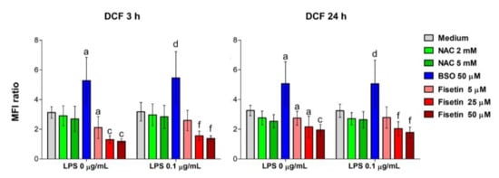 To determine whether ROS generation is modified, HPCs were exposed to NAC, BSO and fisetin with or without 0.1 µg/mL LPS for 3 h or 24 h (Figure 2). Cells were exposed in M1 medium only to verify the effect of the single substances without any interference related to additives in M2 and M3. In general, the pattern registered after 3 h and 24 h reveals that the levels of ROS produced are independent of LPS or exposure periods. Physiologically, the amount of ROS generated in untreated pulp cells is 3.1-fold (MFI) greater than the amount in the unstained sample under all experimental conditions. The presence of 2- or 5-mM NAC slightly reduces DCF fluorescence. As expected, BSO exposure considerably amplifies the amounts of ROS by about five-fold compared to untreated controls. Finally, a significant dose-dependent decrease in ROS can be registered in the presence of fisetin with or without LPS already after 3 h and at the lowest concentration of 5 µM (two-fold). After that, the amount of ROS is even more decreased, being comparable to one of the unstained samples (around 1.1 with 50 µM fisetin).