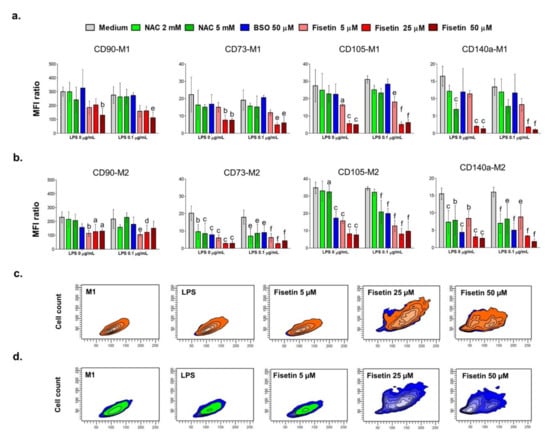 Immunophenotypic profile of human pulp cells. Cell cultures were treated under various experimental conditions for 3 days. Mean fluorescence intensity ratios (MFI ratio) for surface markers CD90, CD73, CD105, and CD140a with M1 (a) and M2 (b) were obtained as described in the Materials and Methods section. Bars represent the MFI of the sample divided by the fluorescence intensity of related isotype controls as mean values ± standard deviations summarized from individual samples in two independent experiments (n = 4). M1 = complete growth medium; M2 = complete growth medium with dexamethasone and β-glycerophosphate. a = p < 0.01, b = p < 0.001 and c = p < 0.0001 between 0 µM and treated samples without LPS (0 µg/mL); d = p < 0.01, e = p < 0.001 and f = p < 0.0001 between LPS alone and treated samples in the presence of LPS (0.1 µg/mL). Forward scatter/Side scatter (FSC/SSC) density dot plots from one representative experiment represent the cell population CD73-positive in orange (c), CD140a positive in green (d) and unstained in blue. The immunophenotypic profile of human pulp cells is weakly influenced by LPS and strongly modulated by fisetin.