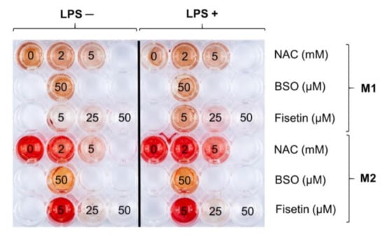Cells from routine culture were seeded (5 × 104/well) in 2 mL of M1 in 6-well plates and allowed to adhere for 48 h. Cell cultures to be treated with BSO were pre-incubated 24 h after seeding with 50 µM BSO for 18 h. Then, cell cultures were exposed to BSO (50 µM), NAC (2 mM or 5 mM) or fisetin (5 µM, 25 µM or 50 µM) both in the presence or absence of LPS (0.1 µg/mL).