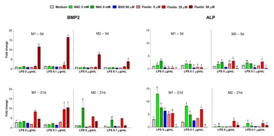 Gene expression of bone morphogenic protein 2 (BMP2) and alkaline phosphatase (ALP) in the various experimental conditions. Bars represent delta CT-values of gene expression as mean values ± standard deviations normalized to RPS18 expression. Data presented are summarized from three independent experiments (n = 4). M1 = complete growth medium; M2 = complete growth medium with dexamethasone and β-glycerophosphate. a = p < 0.01, b = p < 0.001 and c = p < 0.0001 between 0 µM and treated samples without LPS (0 µg/mL); d = p < 0.01, e = p < 0.001 and f = p < 0.0001 between LPS alone and treated samples in the presence of LPS (0.1 µg/mL); * = p < 0.01 between M1 or M2 after 3 days and M1 or M2 after 21 days. The expression of BMP2 and ALP depends on the cellular redox homeostasis, which is modified by the pro-oxidant BSO and the antioxidants NAC and fisetin.
