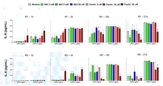 Secretion of IL-6 is upregulated by LPS during the immunomodulation, and the expression of this cytokine has been recently related to MSC commitment to osteogenesis. Therefore, a time course of released IL-6—which is has not yet been examined in this population of HPCs—was run out and its amount was quantified in the various experimental conditions every 72 h, starting from 1 day to 21 days of culture (Figure 6 and Figure S5). LPS stimulation amplifies IL-6 secretion from HPCs under all experimental conditions and after all times of exposure. Interestingly, after 1 day of culture, IL-6 is hardly detectable when cells are cultivated in M2 medium, even in the presence of LPS. On the contrary, cytokine secretion in M1 is dramatically increased by LPS compared to untreated cells (213.2 pg/mL and 20.8 pg/mL, respectively). Moreover, all substances administered modulate IL-6, mainly fisetin at the concentration of 50 µM. Likewise, after 3 days of exposure in M1, the release of IL-6 is enormously raised by LPS to 481 pg/mL independent from other substances. In contrast, a significant dose-dependent increase in IL-6 levels is induced by fisetin in the absence of LPS (471 pg/mL with fisetin 50 µM). In the presence of M2 after 3 days, only the highest dose of fisetin caused an increase in IL-6 secretion in HPCs without LPS. In contrast to the stimulation in M1, LPS fails in increasing IL-6 when HPCs are cultivated in the M2 medium. In parallel, all substances modulate cytokine secretion, mainly NAC and fisetin. After 15 days, LPS stimulation increases the IL-6 amounts both in M1 and M2 to around 600 pg/mL. IL-6 is highly produced in the presence of all substances without LPS, mainly with BSO (528 pg/mL) and 5 µM fisetin in M1 (424 pg/mL). In the presence of LPS, the decreased secretion of IL-6 seems to be independent from the substances both in the M1 and in the M2, except for 50 µM fisetin M2. Finally, after 21 days of LPS stimulation, the concentration of IL-6 remains high at around 700 pg/mL both in M1 and M2 (around 700 pg/mL), and the modulation in the presence of LPS is still independent from substances except for 25 and 50 µM fisetin which decrease the amount of IL-6 to about 400 pg/mL in M2.