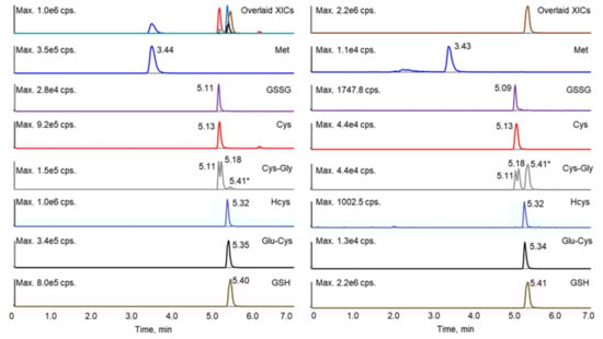 Extracted ion chromatograms of the standard mixture prepared at 200 ng/mL (left) and a representative sample (right). * The peak at 5.41 min in the Cys-Gly panel (grey) was contributed by GSH.