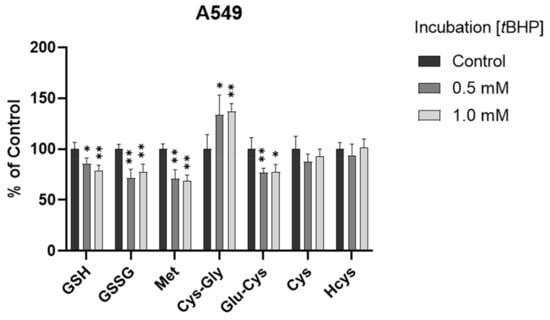 Alteration of analytes in A549 cells after 2 h tBHP treatment (n = 6). The levels in treatment groups were normalized to those of the control group. *, p < 0.05; **, p < 0.001.