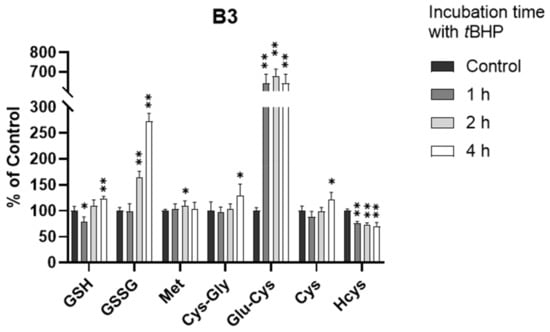 3.4. Assessment of Intracellular Redox Status in B3 Cells with tBHP Treatment