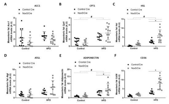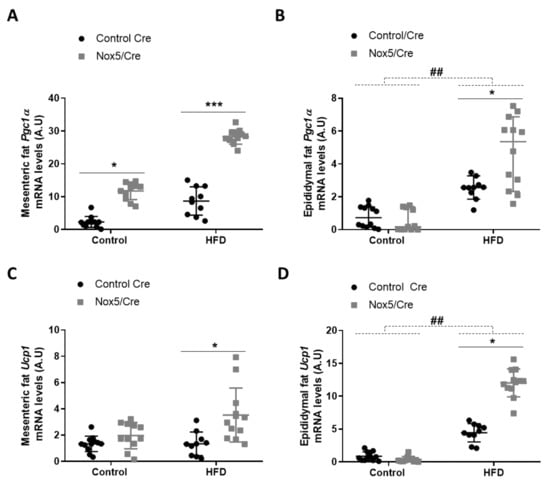 3.1. Endothelial Expression of NOX5 in Mice Fed with a High-Fat Diet Induced the Expression of Genes Related to Thermogenesis and Lipolysis
