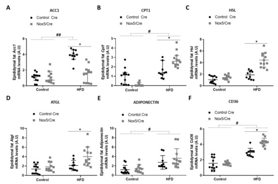 - Garcia, J.G.; Ansorena, E.; Milagro, F.I.; Zalba, G.; de Miguel, C. Endothelial Nox5 Expression Modulates Glucose Uptake and Lipid Accumulation in Mice Fed a High-Fat Diet and 3T3-L1 Adipocytes Treated with Glucose and Palmitic Acid. Int. J. Mol. Sci. 2021, 22. [Google Scholar] [CrossRef]