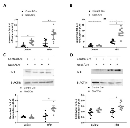 Chicago/Turabian StyleGarcía, Jorge G., Carlos de Miguel, Fermín I. Milagro, Guillermo Zalba, and Eduardo Ansorena. 2022. "Endothelial NOX5 Expression Modulates Thermogenesis and Lipolysis in Mice Fed with a High-Fat Diet and 3T3-L1 Adipocytes through an Interleukin-6 Dependent Mechanism" Antioxidants 11, no. 1: 30. https://doi.org/10.3390/antiox11010030