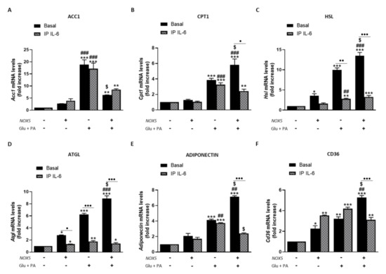 - Carey, A.L.; Steinberg, G.R.; Macaulay, S.L.; Thomas, W.G.; Holmes, A.G.; Ramm, G.; Prelovsek, O.; Hohnen-Behrens, C.; Watt, M.J.; James, D.E.; et al. Interleukin-6 increases insulin-stimulated glucose disposal in humans and glucose uptake and fatty acid oxidation in vitro via AMP-activated protein kinase. Diabetes 2006, 55, 2688–2697. [Google Scholar] [CrossRef] [Green Version]