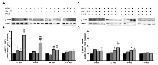 - Kelly, M.; Gauthier, M.S.; Saha, A.K.; Ruderman, N.B. Activation of AMP-activated protein kinase by interleukin-6 in rat skeletal muscle: Association with changes in cAMP, energy state, and endogenous fuel mobilization. Diabetes 2009, 58, 1953–1960. [Google Scholar] [CrossRef] [PubMed] [Green Version]