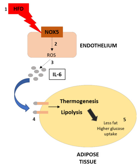 Endothelial NOX5 Expression Modulates Thermogenesis and Lipolysis in Mice Fed with a High-Fat Diet and 3T3-L1 Adipocytes through an Interleukin-6 Dependent Mechanism