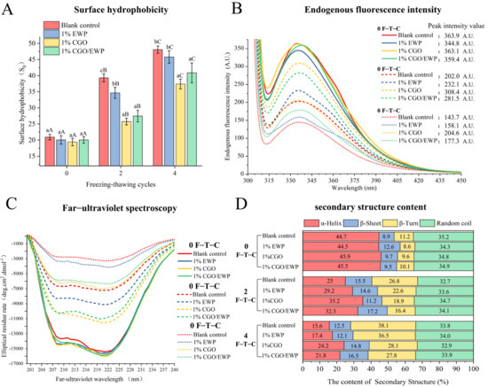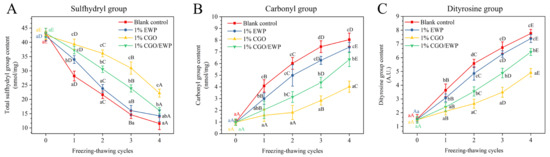 Surface hydrophobicity can reflect the exposure degree of MP hydrophobic amino acids [3]. Naturally, hydrophobic amino acids exist in the protein folding core, but structural changes can expose hydrophobic amino acids to MP surfaces [3]. As shown in Figure 2A, with the increase of F-T-Cs, the surface hydrophobicity increased in the four groups, proving that repeated F-T-Cs led to the exposure of hydrophobic groups. After the second F-T-C, the surface hydrophobicity was significantly (p < 0.05) lower in the CGO (25.74) and CGO/EWP (27.46) groups than in the EWP (34.66) and the blank (39.32) groups.