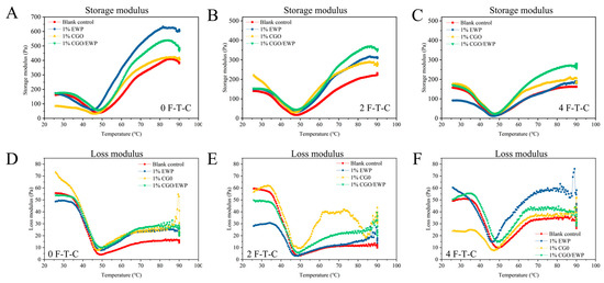 Changes of storage modulus (G′) (A–C) and loss modulus (G″) (D–F) of the temperature sweep of Culter alburnus myofibrillar protein added with EWP, CGO, or CGO/EWP during freezing–thawing cycles. The blank group was not added with EWP, CGO, or CGO/EWP.