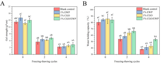 Changes of gel strength (A) and water-holding capacity (B) in the heat-induced gel of Culter alburnus myofibrillar protein added with EWP, CGO or CGO/EWP during freezing–thawing cycles. A significant difference (p < 0.05) between different experimental groups in the same freezing–thawing cycle is expressed by different lowercase letters (a–c), and a significant difference (p < 0.05) between different freezing–thawing cycles in the same experimental group is expressed by different uppercase letters (A–C).