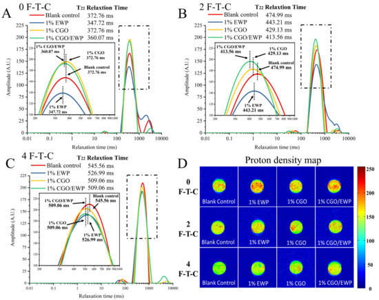 As a technology highlighting water distribution, the proton density map with brighter and redder color indicates more hydrogen protons in the given area [3]. As shown in Figure 5D, after repeated F-T-Cs, the proton image density map of the four experimental groups showed an increase in brightness and a decrease in red area, further showing that F-T-C could weaken the MP gel forming ability, while simultaneously reducing the interaction forces between protein–water molecules and decreasing the water holding ability of gel network. In the 0 F-T-C, the proton imaging results are consistent with the T22 relaxation time results. Compared with the blank and CGO groups, the EWP and CGO/EWP groups had more red areas, indicating that adding EWP could increase the compactness of the gel network and improve the ability of the MP gel to bind water. After the second F-T-C, the CGO/EWP group showed more red areas and higher brightness, indicating that adding EWP/CGO could more effectively delay the degradation of MP gel properties.