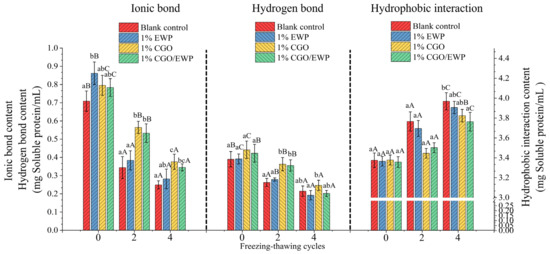 Changes of non-covalent intermolecular interaction in the heat-induced gel of Culter alburnus myofibrillar protein added with EWP, CGO, or CGO/EWP during freezing–thawing cycles. The blank group was not added with EWP, CGO, or CGO/EWP. A significant difference (p < 0.05) between different experimental groups in the same freezing–thawing cycle is expressed by different lowercase letters (a–c), and a significant difference (p < 0.05) between different freezing–thawing cycles in the same experimental group is expressed by different uppercase letters (A–C).