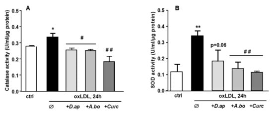 D. apetalum and A. borbonica extracts prevent oxLDL-induced cellular oxidative stress. Effects of polyphenol-rich extracts from D. Apetalum and A. borbonica or curcumin on antioxidant activity of oxLDL-stimulated HMEC-1 cells. Subconfluent serum-starved HMEC-1 cells were preincubated for 2 h with D. apetalum (25 µM), A. borbonica (25 µM) polyphenol-rich extracts or curcumin (10 µM) before addition of oxLDLs (200 μg apoB/mL) for an additional 12 h. (A) Catalase and (B) total SOD activities were expressed as catalytic units per μg of proteins as means ± SEM of at least 3 independent experiments. * p < 0.05; ** p < 0.01 compared to control (ctrl, vehicle PBS); # p < 0.05; ## p < 0.01 compared to oxLDLs were calculated using one-way ANOVA with Tukey’s posthoc test.