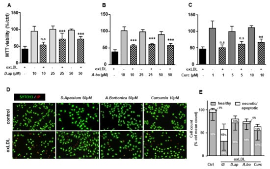 D. apetalum and A. borbonica extracts exert cytoprotective effects on oxLDL-stimulated HMEC-1 cells. Analysis of cell viability in HMEC-1 cells was evaluated by MTT assay. Subconfluent serum-starved HMEC-1 cells were preincubated for 2 h with (A) D. apetalum (10–50 µM), (B) A. borbonica (10–50 µM) and (C) curcumin (1–10 µM) before addition of oxLDLs (200 μg apoB/mL), for 24 h. MTT reduction and cell viability was analyzed as described. Results are expressed as percentage of untreated control cells (vehicle, PBS) and represent mean ± SEM of 4 independent experiments. (D) SYTO-13/PI staining of HMEC-1 cells pretreated with plant extracts or curcumin followed by addition of oxLDLs (200 μg apoB/mL, for 24 h), images show protective effect of plant extracts and curcumin towards oxLDL-induced apoptosis. (E) Living, apoptotic, and necrotic cells were counted after staining by SYTO-13/PI as described. Results are expressed as percentage and represent mean ± SEM of at least 4 independent experiments. ** p < 0.01; *** p < 0.001 were calculated using one-way ANOVA with Tukey’s post hoc test. n.s: nonsignificant.