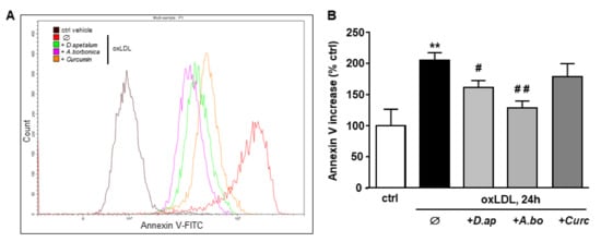 D. apetalum and A. borbonica extracts prevent oxLDL-induced phosphatidylserine exposure. Subconfluent serum-starved HMEC-1 cells were preincubated for 2 h with D. apetalum (25 µM), A. borbonica (25 µM) polyphenol-rich extracts or curcumin (10 µM) before addition of oxLDLs (200 μg apoB/mL) for an additional 24 h. (A) Illustration of detection of Annexin V binding in HMEC-1 cells quantified by flow cytometry using Annexin V-FITC probe. (B) Graph represents percentage of Annexin V fluorescence relative to untreated control HMEC-1 cells (vehicle PBS) in each condition. Results are expressed as means ± SEM of 3 independent experiments. ** p < 0.01 vs. control (ctrl); # p < 0.05; ## p < 0.01 vs. oxLDL using one-way ANOVA with Tukey’s posthoc test.
