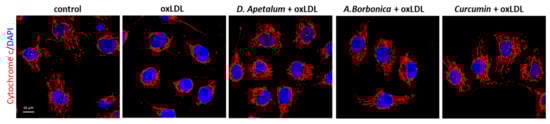 D. apetalum and A. borbonica extracts inhibit oxLDL-induced cytochrome C release from mitochondria to cytosol. Subconfluent serum-starved HMEC-1 cells were preincubated for 2 h with D. apetalum (25 µM), A. borbonica (25 µM) polyphenol-rich extracts or curcumin (10 µM) before addition of oxLDLs (200 μg apoB/mL) for an additional 24 h, control condition corresponds to untreated HMEC-1 cells (vehicle, PBS). Images are representative of immunofluorescence staining of cytochrome C (red) and cell nuclei (blue) stained with DAPI. Scale bar = 10 µm.