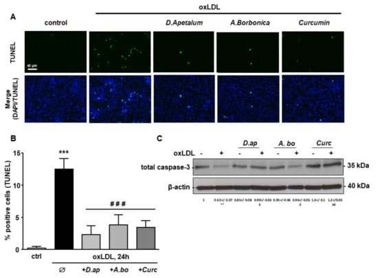 Finally, caspase 3 activation and DNA fragmentation (determined by the TUNEL method), both characteristics of the late apoptotic process, were increased by incubation with oxLDLs and significantly reduced by pretreatment with A. borbonica extract and curcumin (Figure 6 and Figure 7).